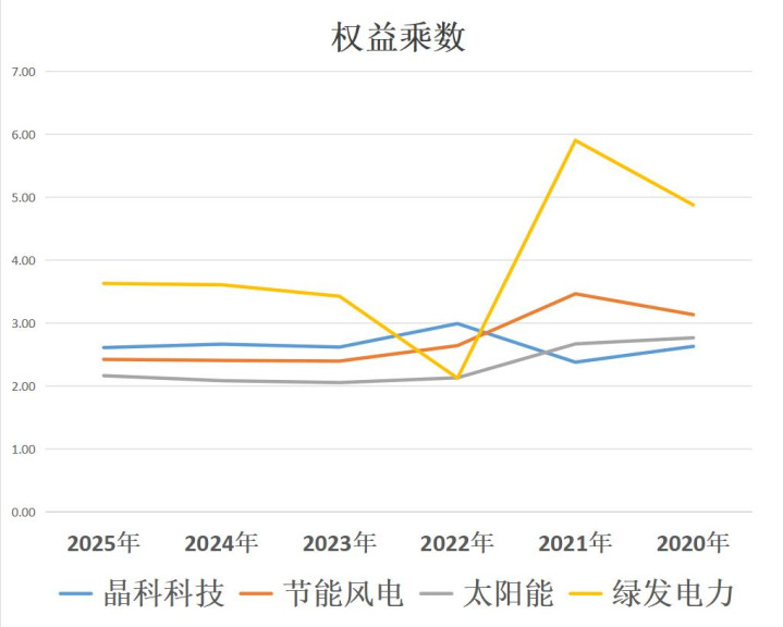 节能风电、太阳能、绿发电力三家的财务杠杆在曩昔五年着落。